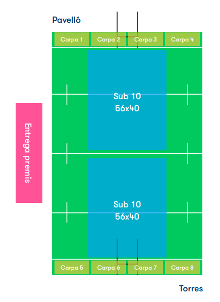 Horari Sub 10 12:15 – 15h (9 min x 3 descans)2 camps: Sub 10 (56×40) 15:15. Entrega premis camp15:30. Tercer temps graderies